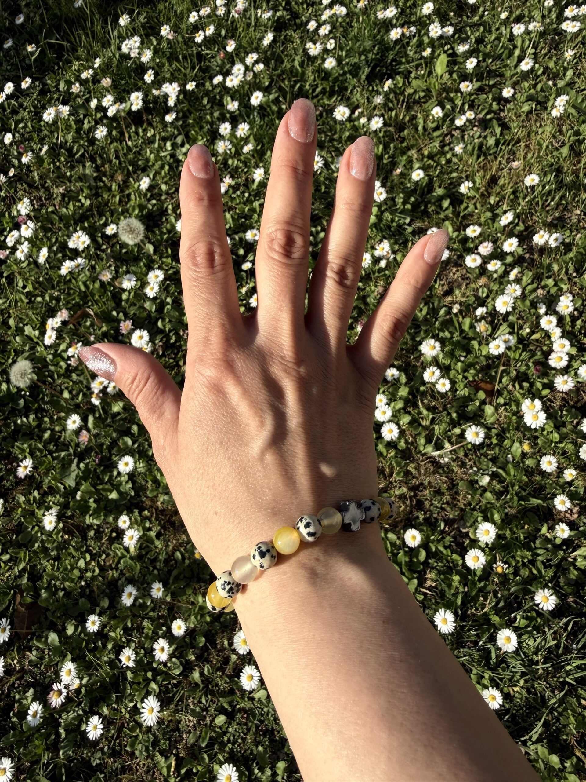 Un bracciale che unisce leggerezza e vitalità. Il diaspro dalmata è associato alla gioia, alla protezione e al radicamento, mentre l’agata gialla porta energia solare, fiducia e stabilità interiore.